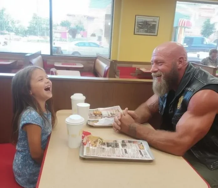 Tall, broad-shouldered, his arms covered in tattoos, his face marked with scars, and his leather vest patched with symbols most people didn’t recognize. Parents in the McDonald’s dining room whispered when he walked in. The manager frowned whenever he ordered food. Even other customers kept their distance, certain he was dangerous.
