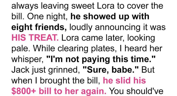 Eight hundred dollars plus. That’s what Jack’s “boys’ night out” bill came to, and he expected his wife, Lora, to foot it. Waitress Melanie, witnessing Lora’s despair, concocted a bold move to ensure Jack’s night didn’t end as he planned.