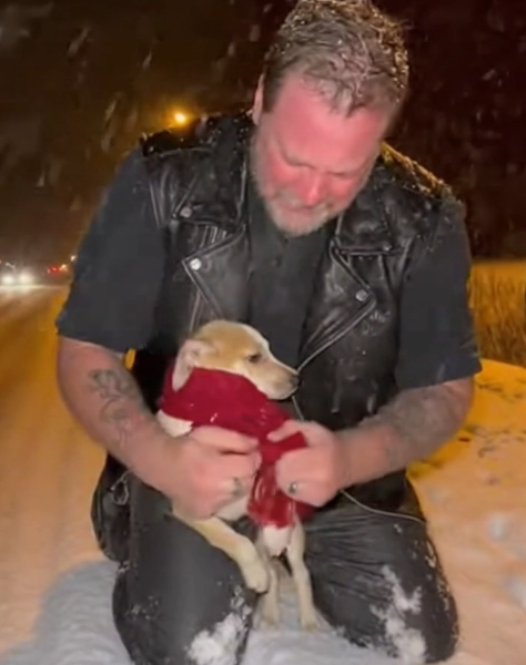 He sat on the ground beside his motorcycle, blocking the wind with his body, and wrapped the dog inside his leather jacket. But the dog still shook uncontrollably.