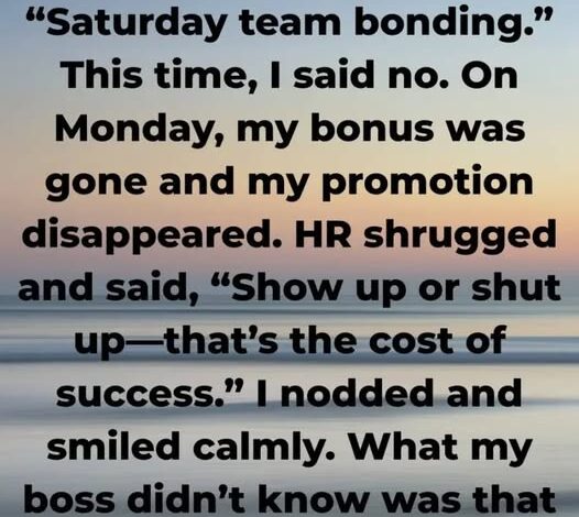 On Monday, my boss cut my bonus and promotion. I went to HR to report retaliation. They laughed and said, “Show up or shut up. That’s the price of being promoted here.”