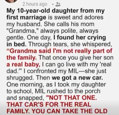 Determined to protect her daughter, she secretly installed cameras around the house and began documenting Susan’s cruel behavior. The final straw came when Susan stopped Lily from sitting in the family’s brand-new SUV, barking that the new car was “for the real family only” and Lily should ride in the old junk car instead.