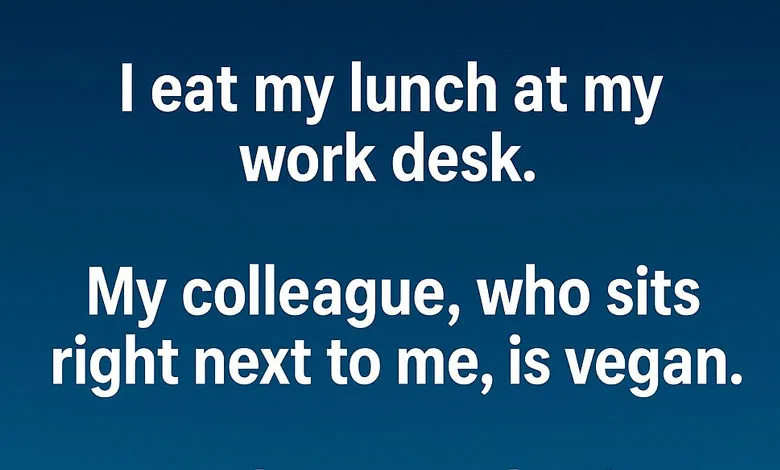 I eat my lunch at my work desk. My colleague, who sits right next to me, is vegan. Yesterday, I was having a burger, and she said gently, “Could you please not bring meat to the desk? The smell makes me feel sick.” Her tone wasn’t harsh, but I could tell it made her uncomfortable. I didn’t know what to say. I wasn’t trying to upset anyone it was just lunch.