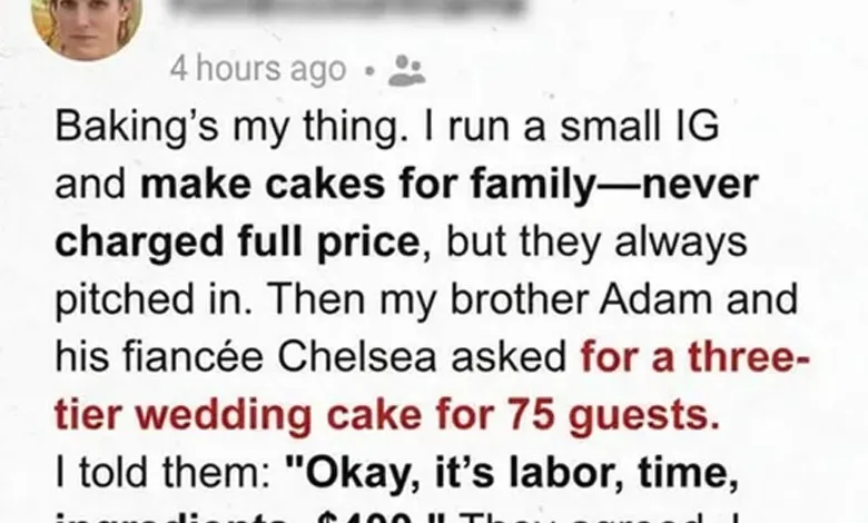 Baking’s my thing. I run a small IG page and make cakes for family—never charging full price, but they always chipped in. Then my brother Adam and his fiancée Chelsea asked for a three-tier wedding cake for 75 guests. I told them, “Okay, it’s labor, time, ingredients. $400.” They agreed. I spent weeks perfecting it—design…