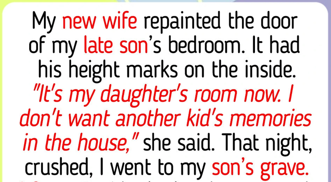 My new wife repainted the door of my late son’s bedroom. It had his height marks on the inside. “It’s my daughter’s room now. I don’t want another kid’s memories in the house,” she said. That night, shattered, I went to my son’s grave. I froze. Right next to the headstone was something I didn’t recognize. There stood a small bronze plaque I had never seen before. I knelt down, my hands trembling as I brushed away the fallen leaves. Engraved in elegant script were the words, “Forever loved. Forever remembered. Forever part of this family.” And beneath it, a date—installed just three weeks ago. I didn’t understand. I drove home in a daze, the questions multiplying with every mile. When I walked through the door, my wife was sitting at the kitchen table, waiting. Before I could speak, she slid a small box toward me. “Open it,” she said quietly. Inside, wrapped in tissue paper, was a strip of painted wood—the exact section of the door that held my son’s height marks, carefully cut out and preserved. Every pencil line. Every scribbled date. Every little note I had written beside them: “First day of 4th grade.” “Finally taller than Mom.” “Almost caught up to Dad.” “I didn’t paint over them,” she whispered, tears welling in her eyes. “I saved them. I was going to frame it for your birthday. I just… I didn’t want my daughter to feel like a guest in her own room. But I would never erase him. He’s part of you, which means he’s part of us now.” I looked at her, confusion and hurt still lingering in my chest. “Then why did you say those things? Why were you so cold?” She took a shaky breath. “Because I needed you to go to his grave tonight. I knew you hadn’t visited in months—I could see the guilt eating you alive, even if you never said it. I knew you wouldn’t go unless something pushed you. So I became the villain. I said words I didn’t mean, words that broke my own heart to say, because I knew they would lead you back to him.” She wiped her eyes. “I had the plaque made because I wanted him to know—even though I never met him—that he has a place in this family. That he’ll never be forgotten. I wanted you to find the plaque on your own. I wanted you to have a moment with your son, just the two of you. Not because I told you to go, but because your heart took you there.” I stared at her, speechless. She reached across the table and took my hand. “I’m sorry I hurt you. But I’d do it again if it meant bringing you back to him.” I couldn’t speak. I just held the piece of wood to my chest, the height marks pressed against my heart, and wept—not from grief this time, but from something I hadn’t felt in years. Gratitude.