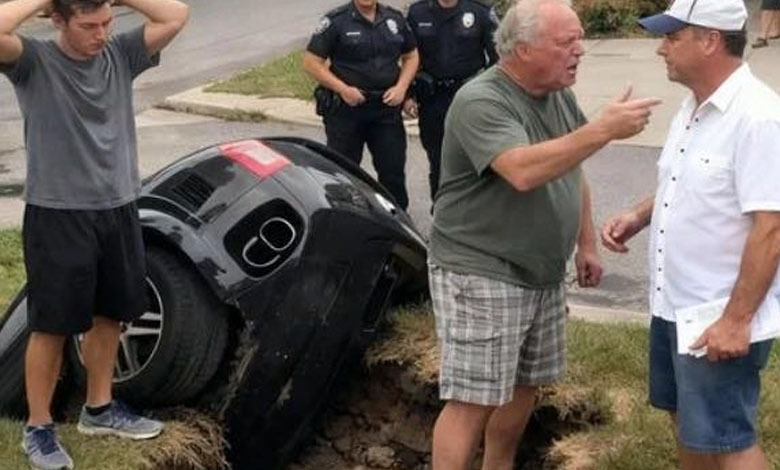 The ground collapsed instantly, swallowing the Lamborghini’s front end with a sound less like a collision and more like finality—carbon fiber meeting reality in a sharp, decisive punctuation that echoed down the street.