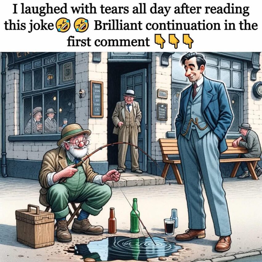 The well-dressed gentleman watched an old man fish in a puddle outside a pub.