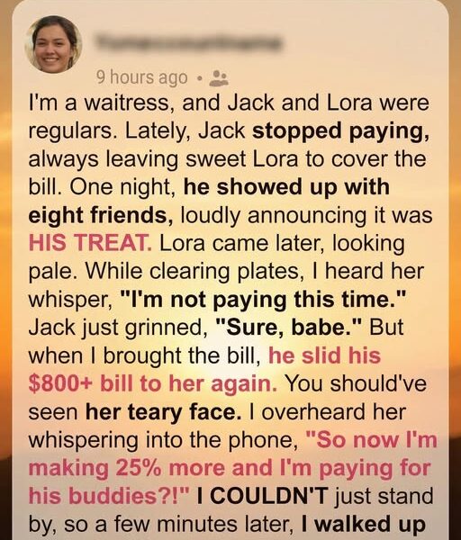 One evening, Jack arrived with a group of friends, announcing loudly that dinner was “on him.” The energy at the table was confident and carefree. When Lora arrived later, her expression told a different story. She looked tired, distracted, as though she had already lived through the night before it truly began. As I cleared plates, I overheard her quietly say she wasn’t paying this time. Jack smiled easily and brushed it off with casual reassurance. But when the check came, he slid it back toward her, just as he had before. The number was high, and her face reflected a mix of shock and resignation that stayed with me long after I walked away.