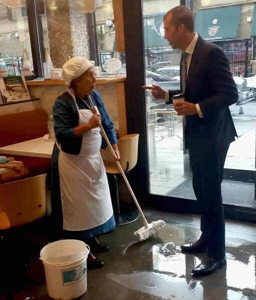 An elderly cleaner stood frozen, trembling as she held onto her mop.