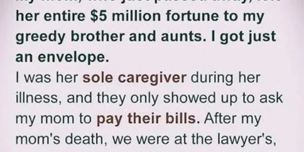 My mom, who just passed away, left her entire $5 million fortune to my greedy brother and aunts. I got just an envelope. I had been her caregiver through every sleepless night and doctor’s visit, while they only came around…