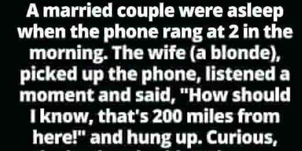 A married couple were asleep when the phone rang at 2 in the morning. The wife (a blonde) picked up the phone, listened for a moment, and said, “How should I know? That’s 200 miles from here!” and hung up….